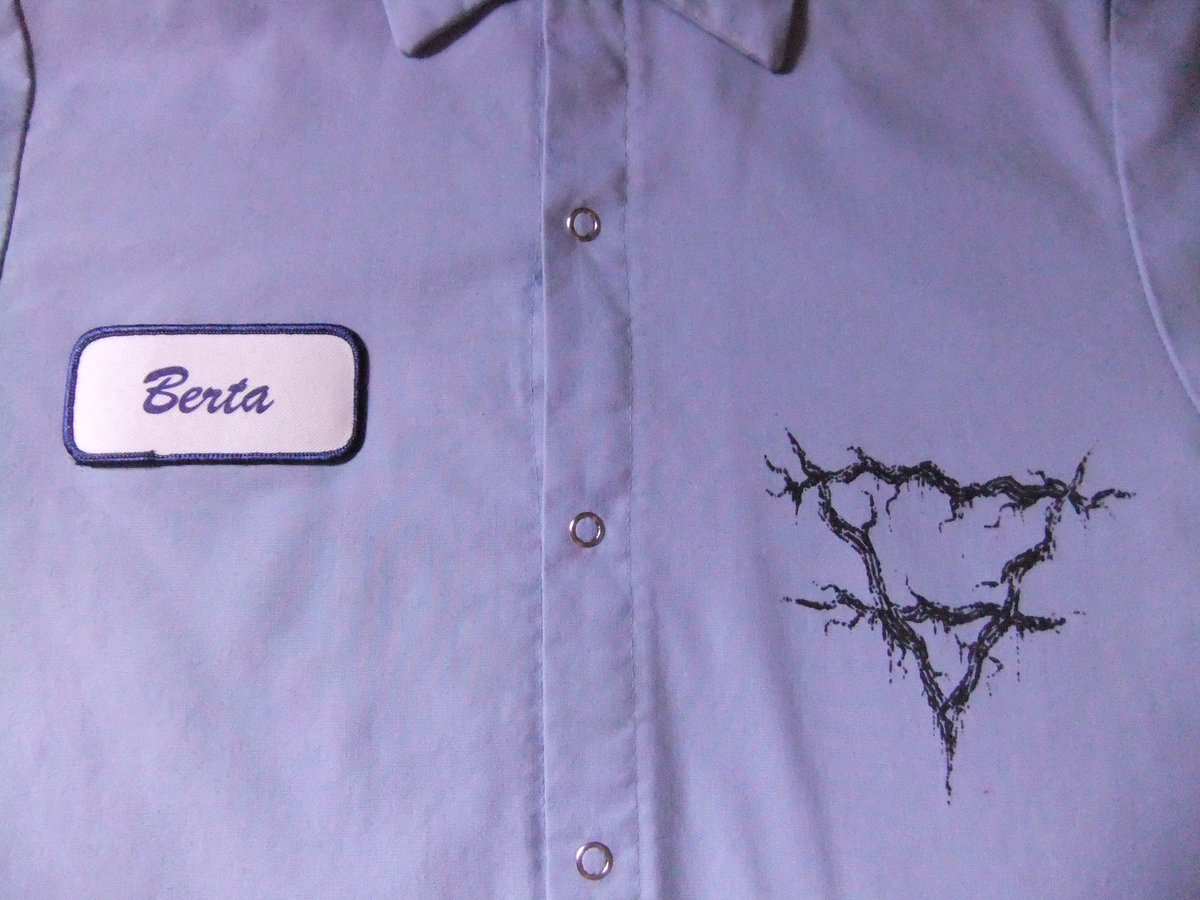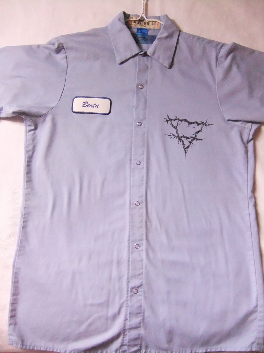 ONE OF A KIND SHIRT*** Arkansas Logo Repurposed Industrial Work Shirt, Small light blue short sleeve, Berta name tag, has Arkansas print on back and small logo on front, Repurposed industrial shirt, will have some wear and possible stains, worn but not worn out. (169874)